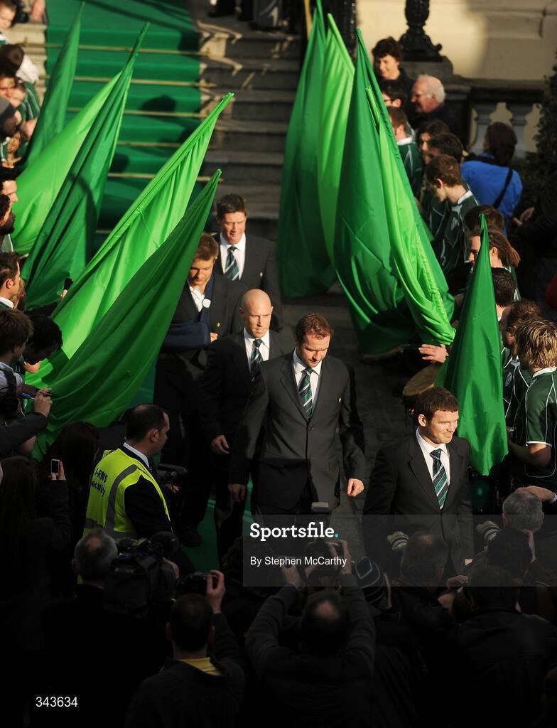 22 March 2009; Ireland players Gordon D'Arcy, Geordan Murphy, Peter Stringer, Luke Fitzgerald and Ronan O'Gara leave the Mansion House after a civic reception on the teams return to Dublin, after completing the Grand Slam. Ireland rugby squad homecoming. Dawson Street, Dublin. Picture credit: Stephen McCarthy / SPORTSFILE