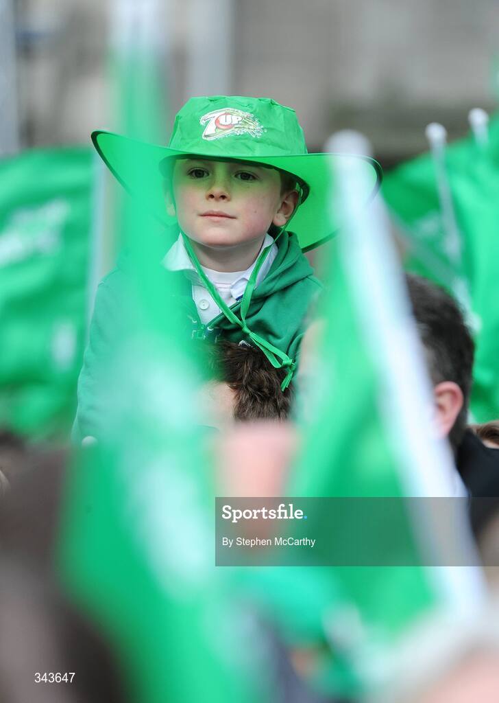 22 March 2009; A young spectator awaits to greet the Ireland team on their return to Dublin after completing the Grand Slam. Ireland rugby squad homecoming. Dawson Street, Dublin. Picture credit: Stephen McCarthy / SPORTSFILE