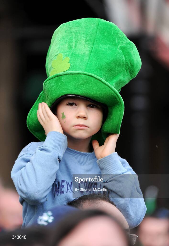 22 March 2009; A young spectator covers his ear from the music as he awaits to greet the Ireland team on their return to Dublin after completing the Grand Slam. Ireland rugby squad homecoming. Dawson Street, Dublin. Picture credit: Stephen McCarthy / SPORTSFILE