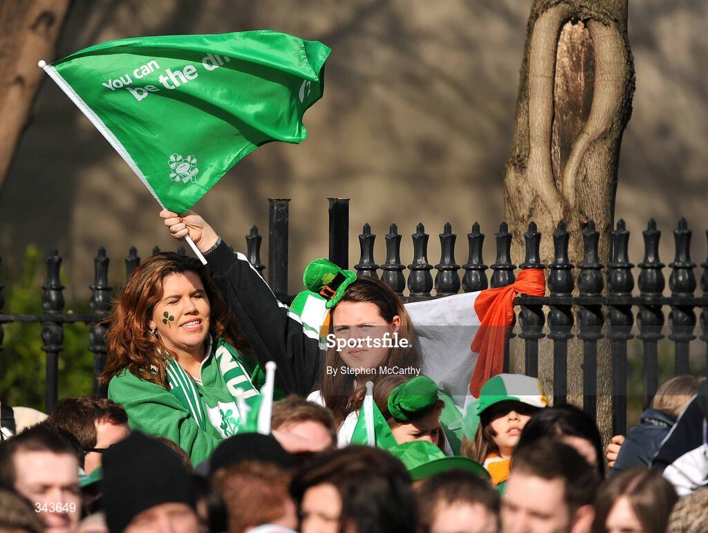 22 March 2009; A spectator waves a flag in Dawson Street to greet the Ireland teams return to Dublin after completing the Grand Slam. Ireland rugby squad homecoming. Dawson Street, Dublin. Picture credit: Stephen McCarthy / SPORTSFILE
