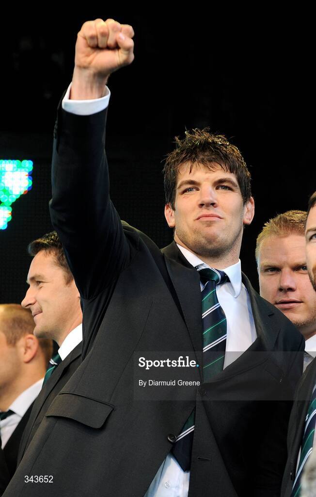 22 March 2009; Ireland's Donncha O'Callaghan celebrates on the teams return to Dublin after completing the Grand Slam. Ireland rugby squad homecoming. Dawson Street, Dublin. Picture credit: Diarmuid Greene / SPORTSFILE