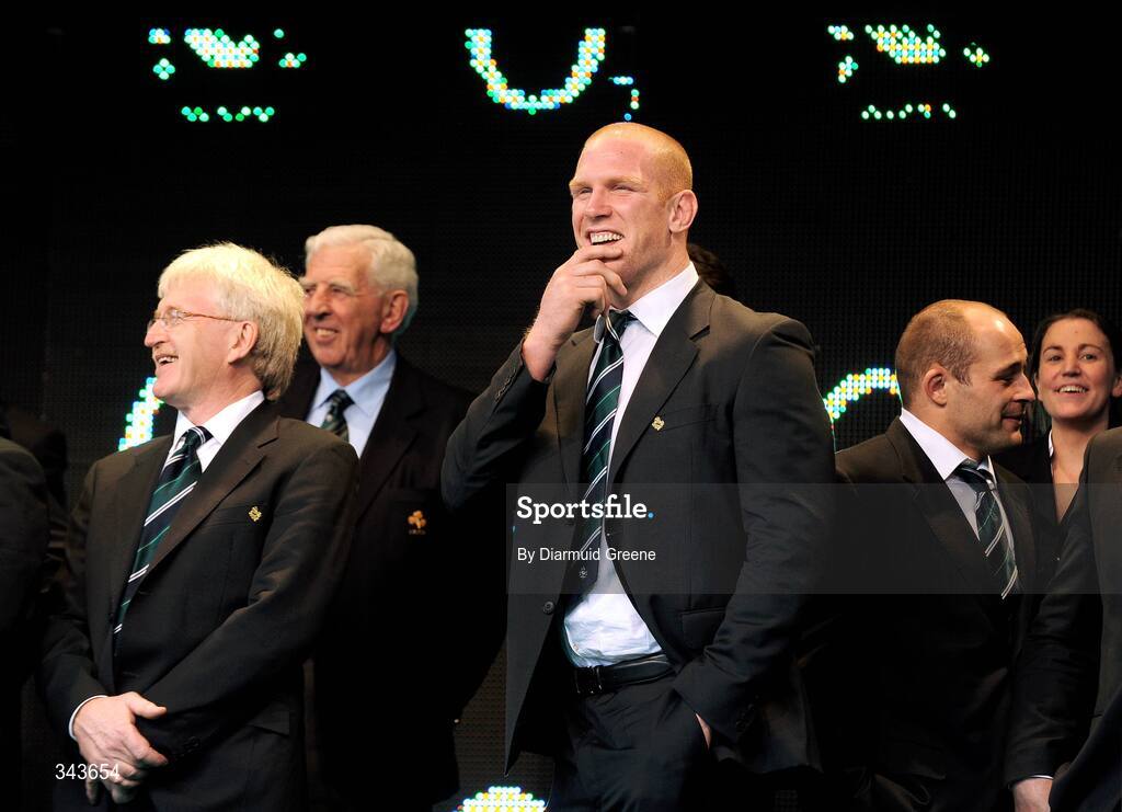 22 March 2009; Ireland's Paul O'Connell in jovial mood, alongside team manager Paul McNaughton, left, as they listen to Tommy Bowe singing to the crowd on the teams return to Dublin after completing the Grand Slam. Ireland rugby squad homecoming. Dawson Street, Dublin. Picture credit: Diarmuid Greene / SPORTSFILE
