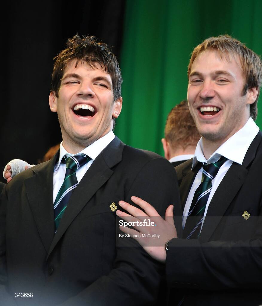 22 March 2009; Ireland's Donncha O'Callaghan, left, and Stephen Ferris on the teams return to Dublin after completing the Grand Slam. Ireland rugby squad homecoming. Dawson Street, Dublin. Picture credit: Stephen McCarthy / SPORTSFILE