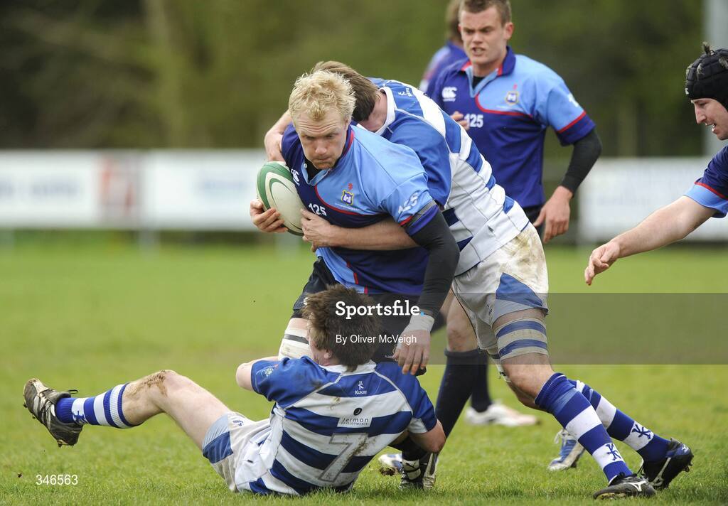11 April 2009; Jaydon Hill, Blackrock, is tackled by Ali Birch and Richard Holmes, Dungannon. AIB League Division 1, Dungannon v Blackrock, Stevenson Park, Dungannon, Co. Tyrone. Picture credit: Oliver McVeigh / SPORTSFILE *** Local Caption ***