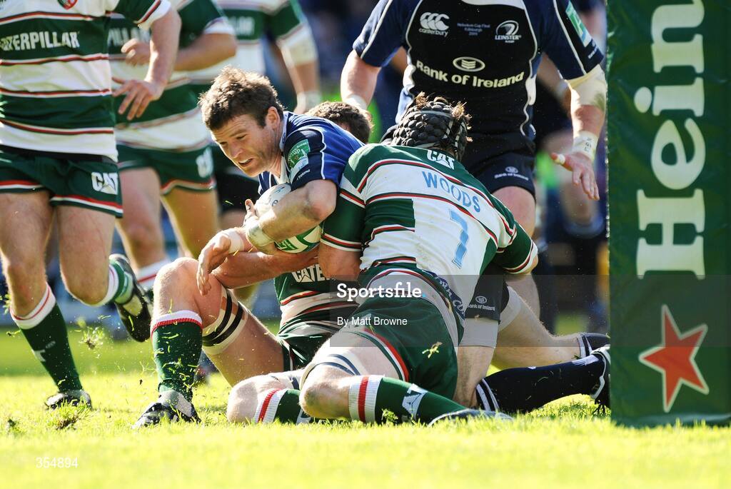 23 May 2009; Gordon D'Arcy, Leinster, is stopped on the line by Leicester Tigers players Ben Woods,7, and Craig Newby. Heineken Cup Final, Leinster v Leicester Tigers, Murrayfield Stadium, Edinburgh, Scotland. Picture credit: Matt Browne / SPORTSFILE