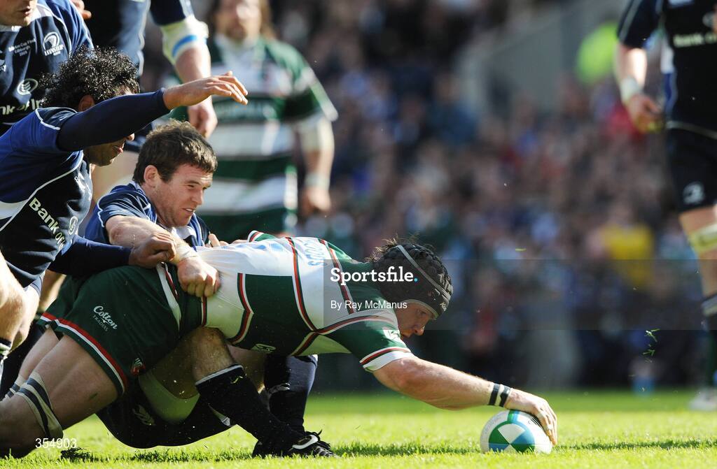 23 May 2009; Ben Woods dives over to score the first try of the game for Leicester Tigers despite being tackled by Shane Jennings and Isa Nacewa, left. Heineken Cup Final, Leinster v Leicester Tigers, Murrayfield Stadium, Edinburgh, Scotland. Picture credit: Ray McManus / SPORTSFILE
