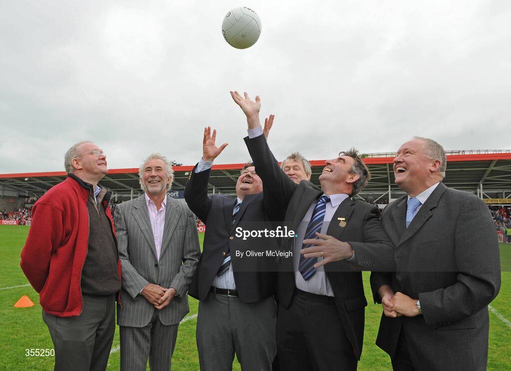 24 May 2009; Ulster GAA President Tom Daly, second from right, contests a high ball along with Martin McGuinness, Deputy First minister, Kevin McCloy, Derry county board chairman, Dominic Walsh, chairman Sport NI, Paraic Duffy, Ard Stiurthoir of the GAA, and Eamon McCartan, Chief Executive Sport NI, during the the official opening ceremony of Celtic Parks new stand. Ulster GAA Football Senior Championship Quarter-Final, Derry v Monaghan, Celtic Park, Derry. Picture credit: Oliver McVeigh / SPORTSFILE