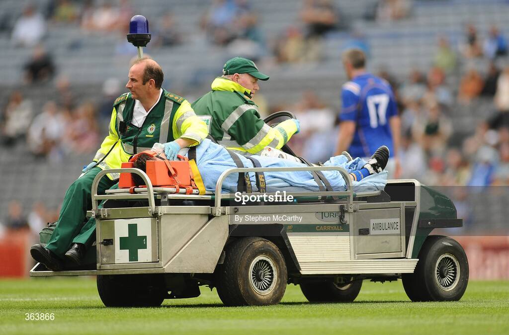 28 June 2009; Kevin Diffley, Longford, is stretchered from the pitch. GAA Football Leinster Junior Championship Final, Louth v Longford, Croke Park, Dublin. Picture credit: Stephen McCarthy / SPORTSFILE