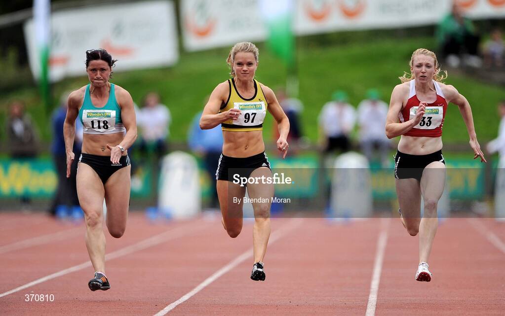 2 August 2009; Ailis McSweeney, 97, Leevale AC, leads eventual fifth Anna Boyle, 118, Ballymena and Antrim AC, and eventual fourth Louise Kiernan, 33, Fingallians AC, on her way to winning the Women's 100m Final. Woodie's DIY / AAI National Senior Track & Field Championships. Morton Stadium, Santry, Dublin. Picture credit: Brendan Moran / SPORTSFILE