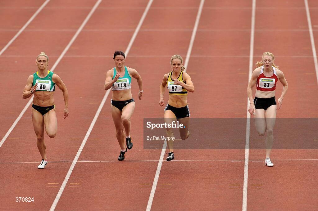 2 August 2009; Ailis McSweeney, Leevale AC, second from right, leads the field on her way to winning the Women's 100m Final ahead of second placed Kelly Proper, Ferrybank AC, extreme left, at the Woodie's DIY / AAI National Senior Track & Field Championships. Morton Stadium, Santry, Dublin. Picture credit: Pat Murphy / SPORTSFILE
