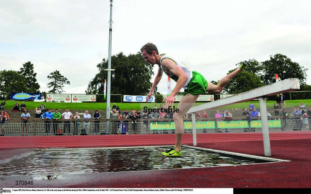 2 August 2009; Mark Kirwan, Raheny Shamrock AC, falls at the water jump on the final lap during the Men's 3000m Steeplechase at the Woodie's DIY / AAI National Senior Track & Field Championships. Morton Stadium, Santry, Dublin. Picture credit: Pat Murphy / SPORTSFILE