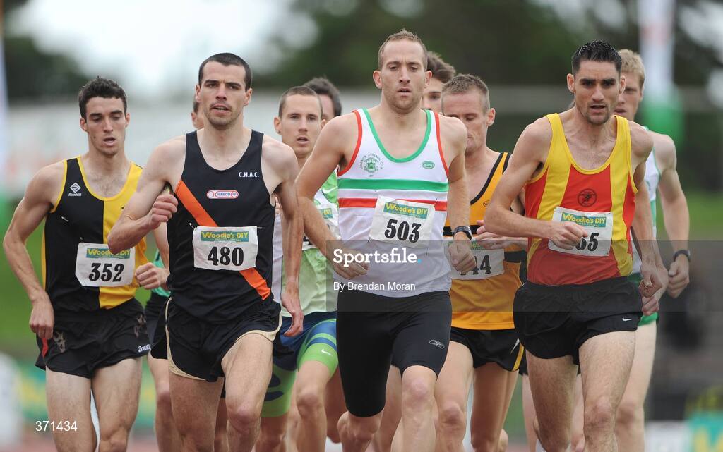 2 August 2009; Mark Kenneally, 480, Clonliffe Harriers AC, and Liam Reale, 503, Limerick AC, lead the field during the Men's 1500m Final. Woodie's DIY / AAI National Senior Track & Field Championships. Morton Stadium, Santry, Dublin. Picture credit: Brendan Moran / SPORTSFILE