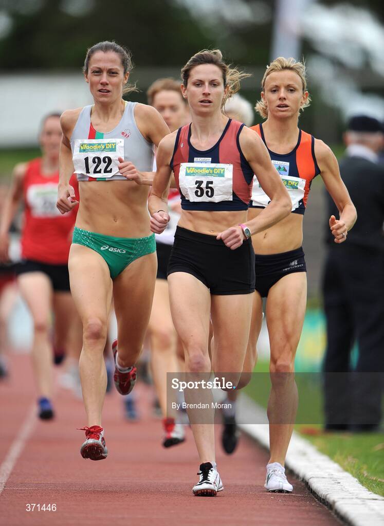 2 August 2009; Deirdre Byrne, 35, Sli Cualann AC, leads eventual second Kelly McNiece, 122, LiscarrollAC, and eventual third Roisin McGettigan, Sli Cualann AA, on her way to winning the Women's 1500m Final. Woodie's DIY / AAI National Senior Track & Field Championships. Morton Stadium, Santry, Dublin. Picture credit: Brendan Moran / SPORTSFILE