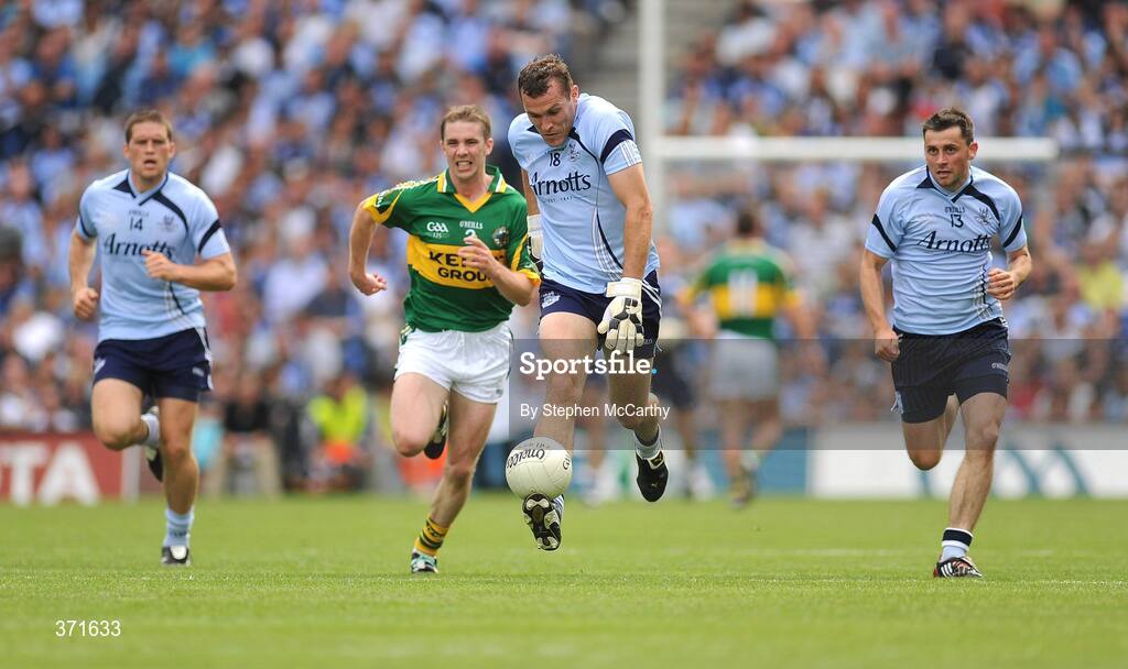 3 August 2009; Ciaran Whelan, Dublin, supported by team-mates Conal Keaney, left, and Alan Brogan, is trailed by Marc O Se, Kerry. GAA Football All-Ireland Senior Championship Quarter-Final, Dublin v Kerry, Croke Park, Dublin. Picture credit: Stephen McCarthy / SPORTSFILE