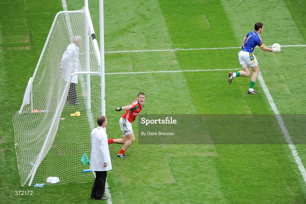 9 August 2009; Aidan Kilcoyne, Mayo, appeals to an umpire as Meath goalkeeper Paddy O'Rourke clears his lines. GAA Football All-Ireland Senior Championship Quarter-Final, Meath v Mayo, Croke Park, Dublin. Picture credit: Daire Brennan / SPORTSFILE