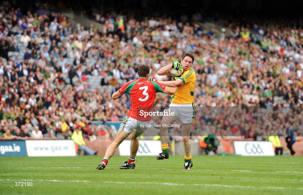 9 August 2009; Peadar Byrne, Meath, in action against Ger Cafferkey, Mayo. GAA Football All-Ireland Senior Championship Quarter-Final, Meath v Mayo, Croke Park, Dublin. Picture credit: Stephen McCarthy / SPORTSFILE
