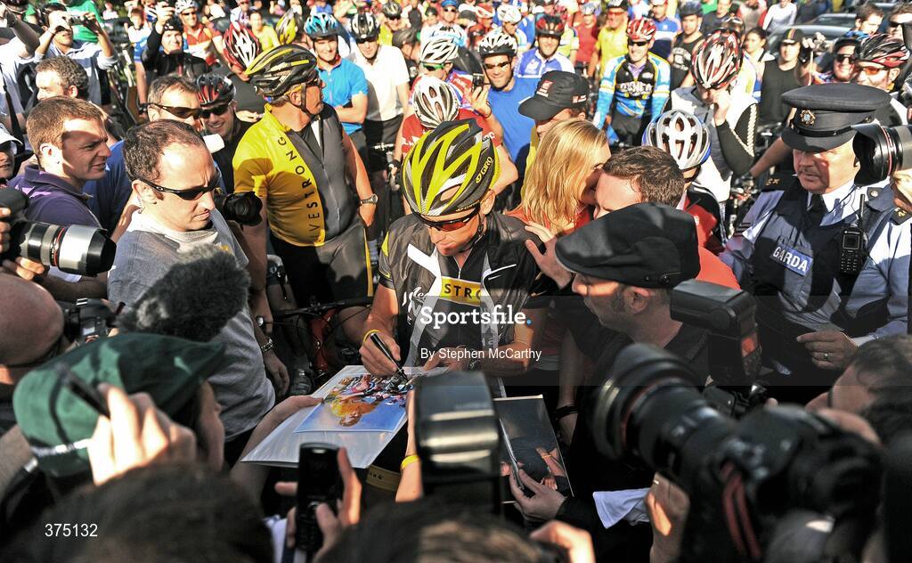 25 August 2009; Seven times winner of the Tour de France Lance Armstrong signs autographs before being joined by cycling fans for a ride in the Phoenix Park, Dublin. Picture credit: Stephen McCarthy / SPORTSFILE