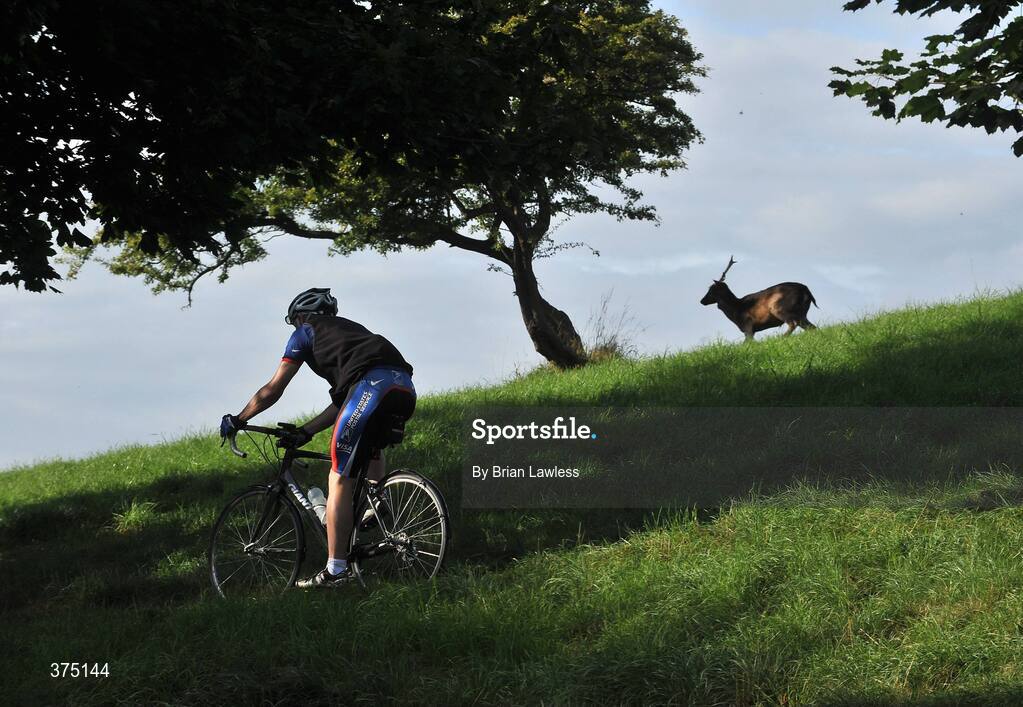 25 August 2009; A cyclist passes a deer during a cycle led by Lance Armstrong in the Phoenix Park, Dublin. Picture credit: Brian Lawless / SPORTSFILE