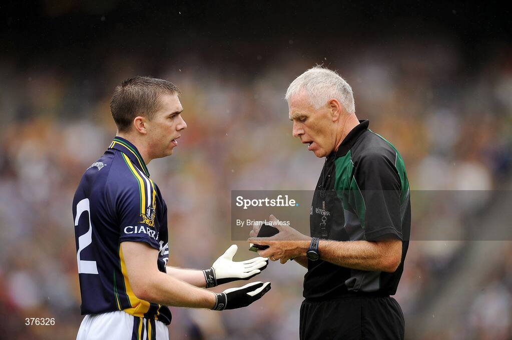 30 August 2009; Mark O Se, Kerry, remonstrates with referee Gearoid O Conamha. GAA All-Ireland Senior Football Championship Semi-Final, Kerry v Meath, Croke Park, Dublin. Picture credit: Brian Lawless / SPORTSFILE