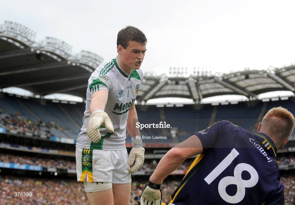 30 August 2009; Meath goalkeeper Paddy O'Rourke argues with Kerry's Tommy Walsh during the match. GAA All-Ireland Senior Football Championship Semi-Final, Kerry v Meath, Croke Park, Dublin. Picture credit: Brian Lawless / SPORTSFILE