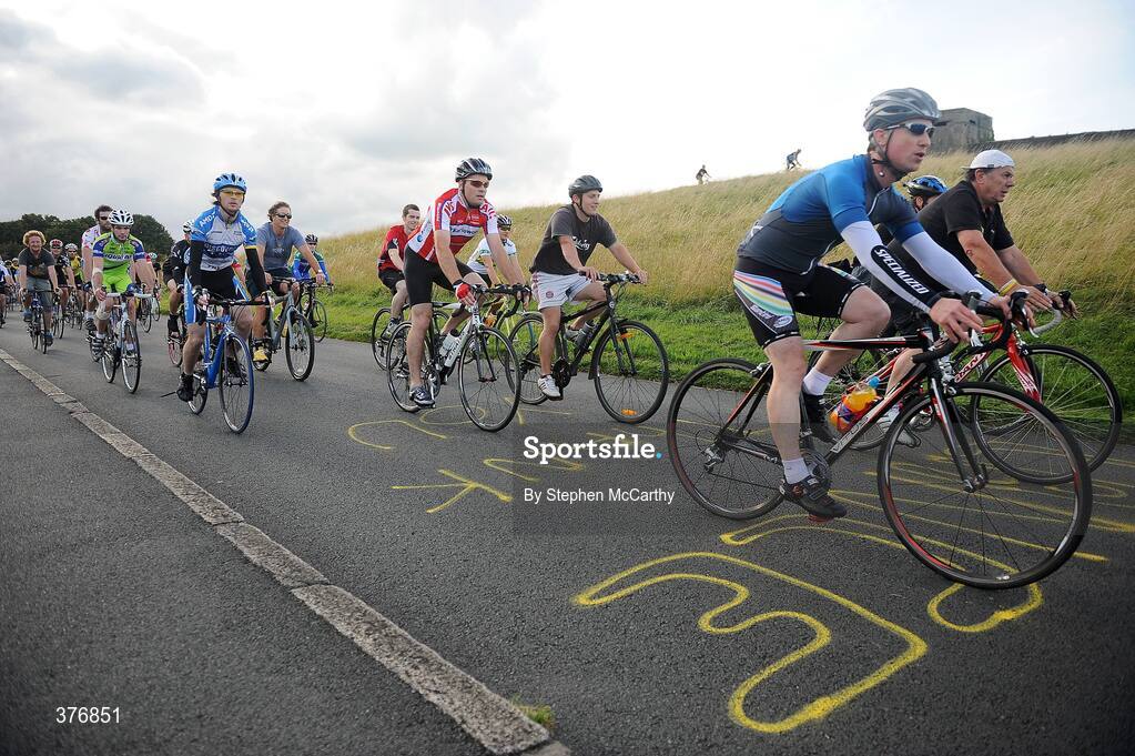 25 August 2009; Cyclists pass over a good will message as they pursue seven times winner of the Tour de France Lance Armstrong during a ride in the Phoenix Park, Dublin. Picture credit: Stephen McCarthy / SPORTSFILE