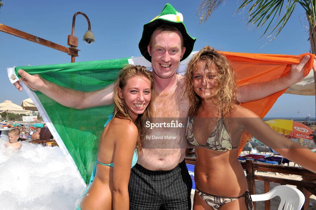 4 September 2009; Republic of Ireland fan Dan Doonan, from Killarney, Co. Kerry, with Lena and Renata, both from Nicosia, Cyprus, in Ayia Napa ahead of their 2010 FIFA World Cup Qualifier against Cyprus on Saturday. Ayia Napa, Cyprus. Picture credit: David Maher / SPORTSFILE