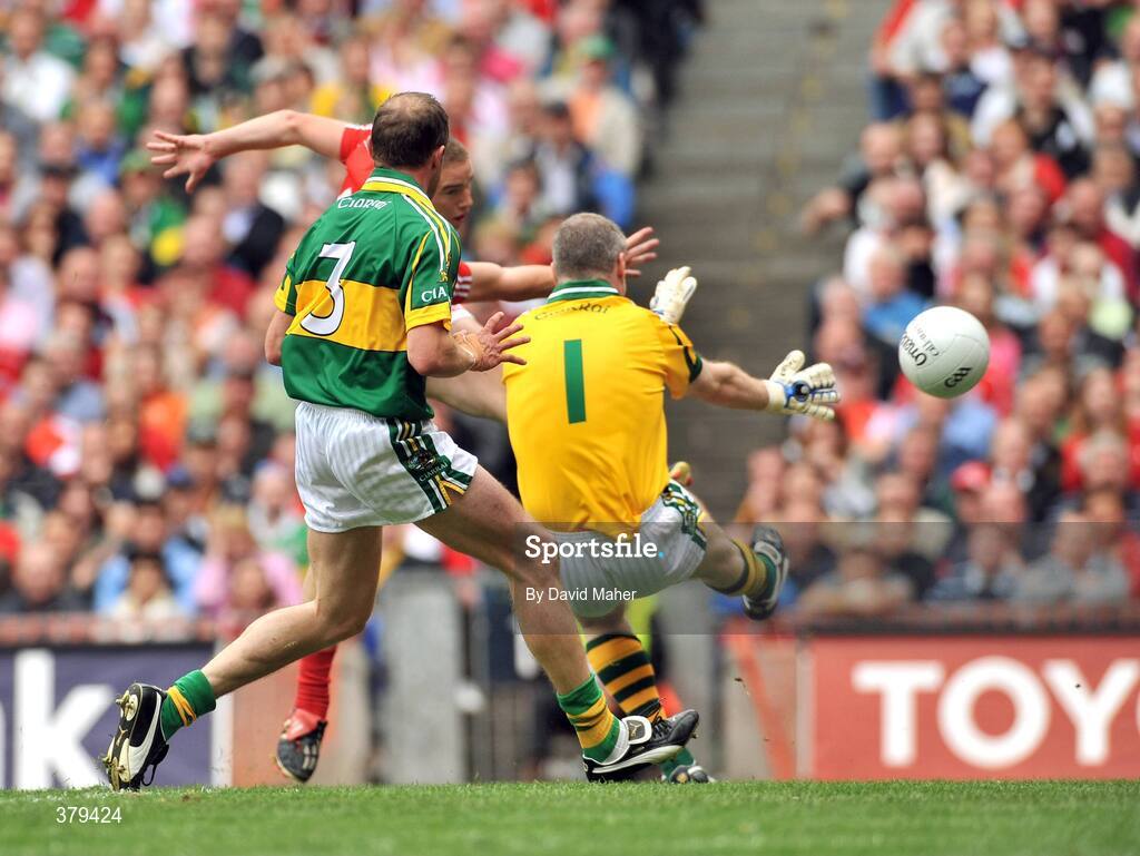 20 September 2009; Colm O'Neill, Cork, beats Kerry goalkeeper Diarmuid Murphy and Tommy Griffin, 3, to score his side's first goal. GAA Football All-Ireland Senior Championship Final, Kerry v Cork, Croke Park, Dublin. Picture credit: David Maher / SPORTSFILE