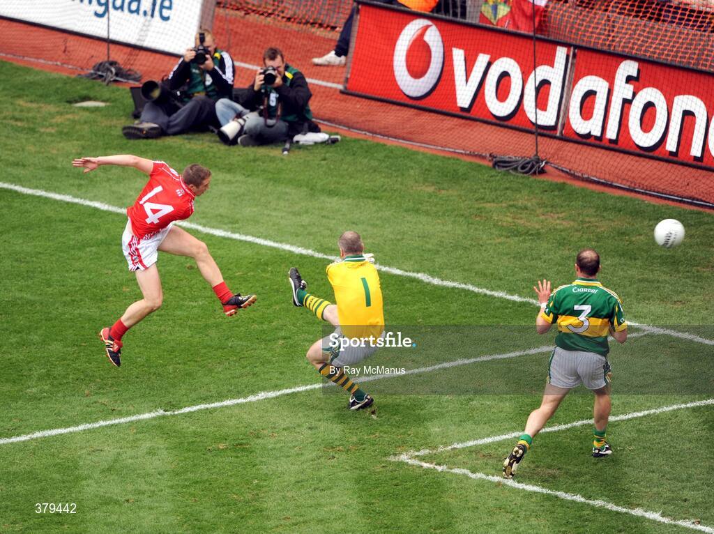 20 September 2009; Colm O'Neill, Cork, shoots past Kerry full-back Tommy Griffin and goalkeeper Diarmuid Murphy to score the first goal of the game in the 10th minute. GAA Football All-Ireland Senior Championship Final, Kerry v Cork, Croke Park, Dublin. Picture credit: Ray McManus / SPORTSFILE