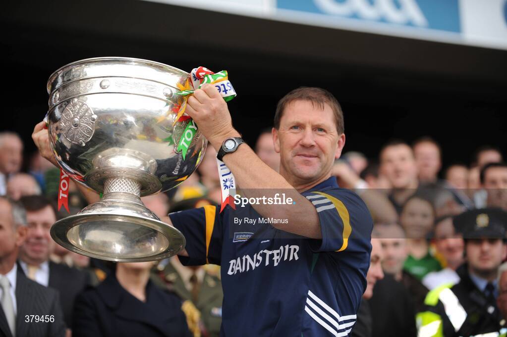 20 September 2009; Kerry manager Jack O'Connor lifts the Sam Maguire Cup. GAA Football All-Ireland Senior Championship Final, Kerry v Cork, Croke Park, Dublin. Picture credit: Ray McManus / SPORTSFILE
