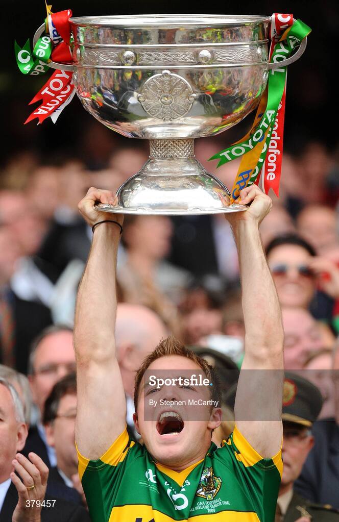 20 September 2009; Kerry captain Darran O'Sullivan lifts the Sam Maguire cup. GAA Football All-Ireland Senior Championship Final, Kerry v Cork, Croke Park, Dublin. Picture credit: Stephen McCarthy / SPORTSFILE