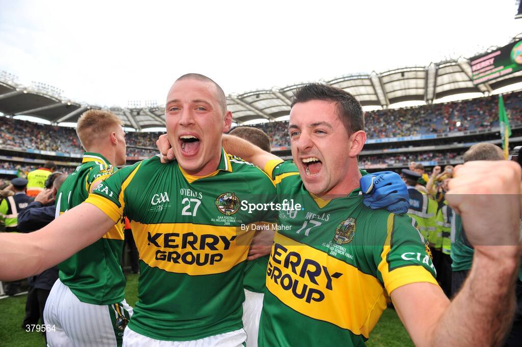 20 September 2009; Kieran Donaghy, left, Kerry, celebrates with team-mate Aidan O'Mahony at the end of the game. GAA Football All-Ireland Senior Championship Final, Kerry v Cork, Croke Park, Dublin. Picture credit: David Maher / SPORTSFILE