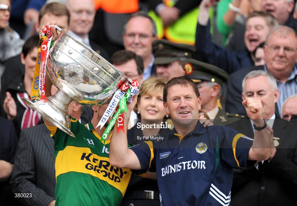 20 September 2009; Kerry manager Jack O'Connor and Paul Galvin, left, lift the Sam Maguire Cup. GAA Football All-Ireland Senior Championship Final, Kerry v Cork, Croke Park, Dublin. Picture credit: Pat Murphy / SPORTSFILE