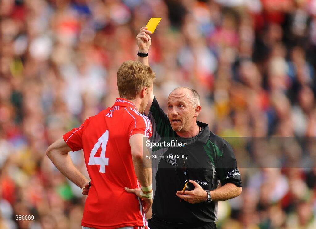 20 September 2009; Referee Martin Duffy issues a yellow card to Anthony Lynch. GAA Football All-Ireland Senior Championship Final, Kerry v Cork, Croke Park, Dublin. Picture credit: Stephen McCarthy / SPORTSFILE
