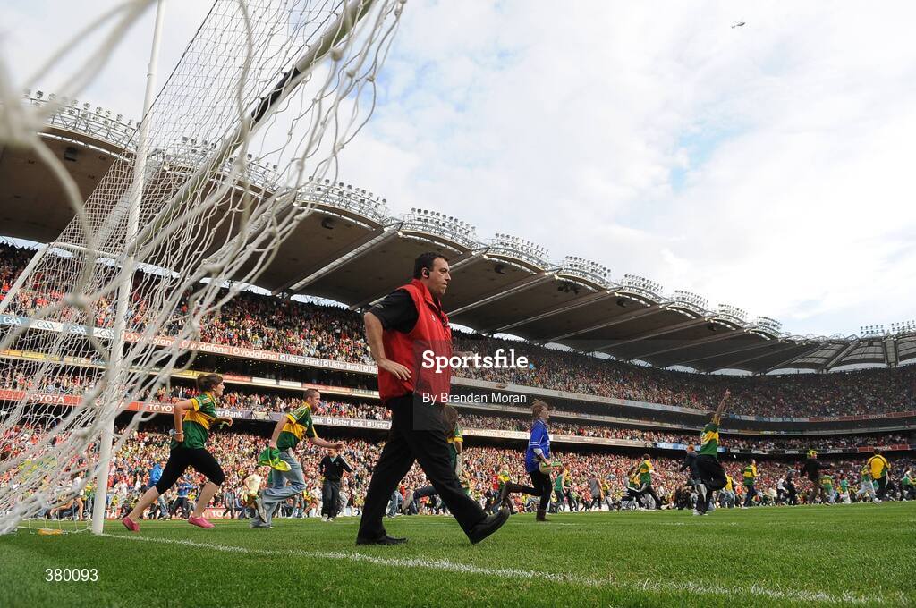 20 September 2009; Security personnel get into position to protect the goalmouth and posts as Kerry supporters run onto the pitch to celebrate after the final whistle. GAA Football All-Ireland Senior Championship Final, Kerry v Cork, Croke Park, Dublin. Picture credit: Stephen McCarthy / SPORTSFILE