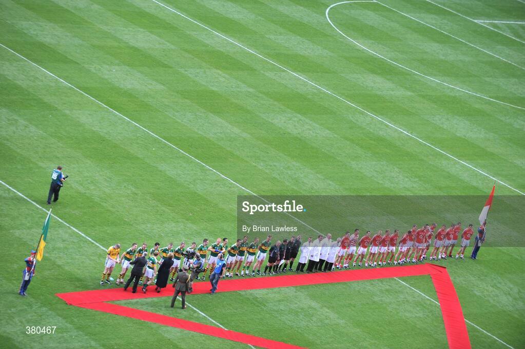 20 September 2009; President Mary McAleese accompanied by Uachtarán Chumann Lúthchleas Gael Criostóir Ó Cuana and Kerry captain Darran O'Sullivan is introduced to the Kerry players. GAA Football All-Ireland Senior Championship Final, Kerry v Cork, Croke Park, Dublin. Picture credit: Brian Lawless / SPORTSFILE