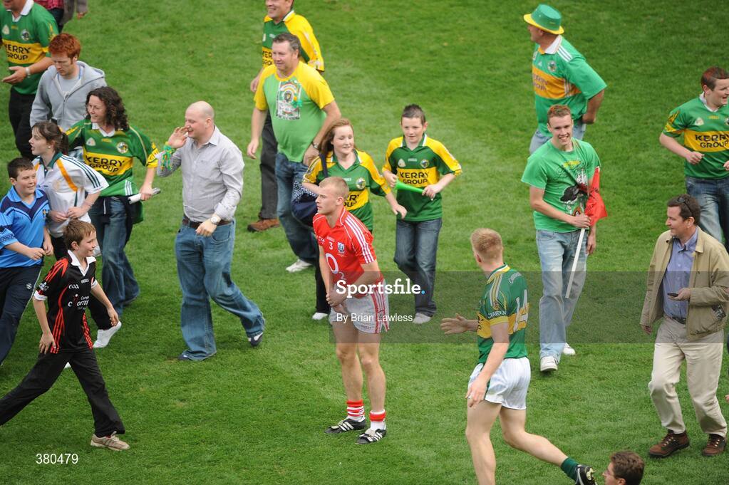 20 September 2009; Cork's Michael Shields is surrounded by celebrating Kerry fans as Kerry's Tommy Walsh makes his way to shake hands. GAA Football All-Ireland Senior Championship Final, Kerry v Cork, Croke Park, Dublin. Picture credit: Brian Lawless / SPORTSFILE