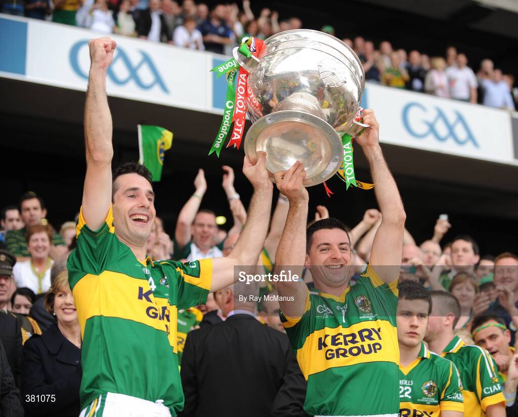 20 September 2009; Rathmore club-mates Tom O'Sullivan, left, and Aidan O'Mahony, Kerry, lift the Sam Maguire Cup. GAA Football All-Ireland Senior Championship Final, Kerry v Cork, Croke Park, Dublin. Picture credit: Ray McManus / SPORTSFILE