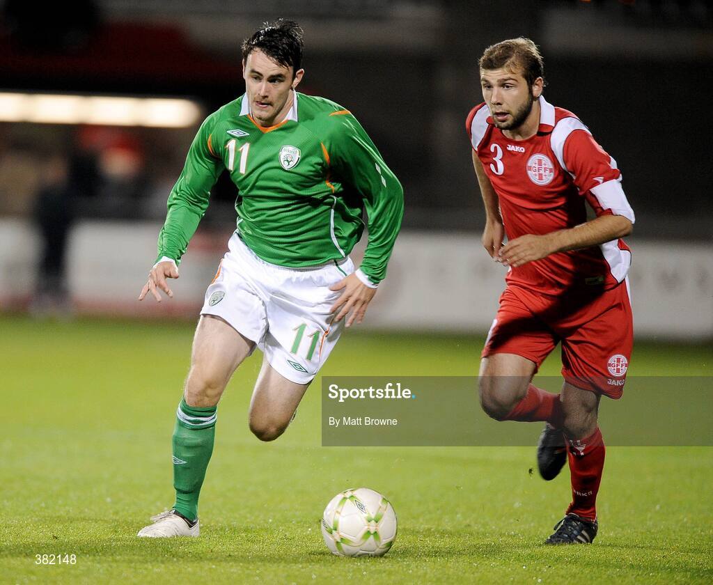9 October 2009; Keith Treacy, Republic of Ireland, in action against Gulverd Tomashvili, Georgia. UEFA European U21 Championship Qualifier, Republic of Ireland v Georgia, Tallaght Stadium, Tallaght, Dublin. Picture credit: Matt Browne / SPORTSFILE