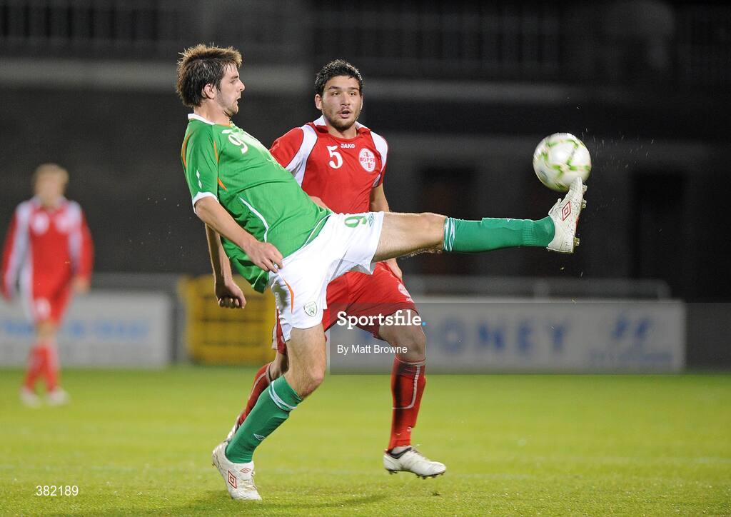 9 October 2009; Cillian Sheridan, Republic of Ireland, in action against Murtaz Daushvili, Georgia. UEFA European U21 Championship Qualifier, Republic of Ireland v Georgia, Tallaght Stadium, Tallaght, Dublin. Picture credit: Matt Browne / SPORTSFILE