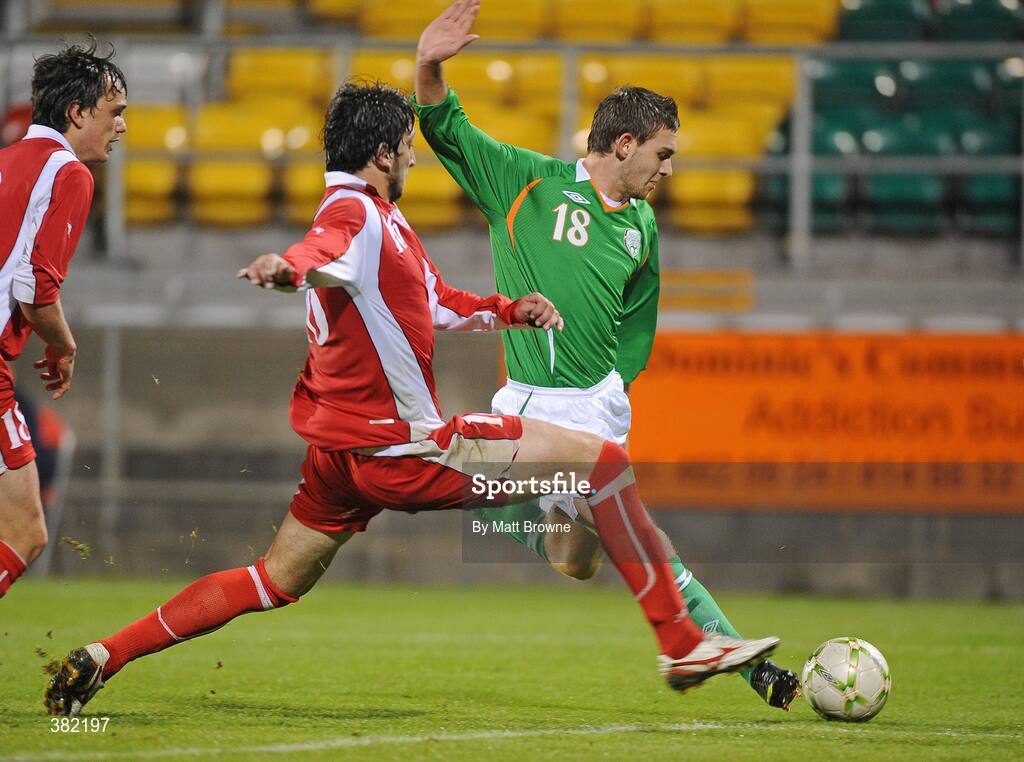 9 October 2009; Jay O'Shea, Republic of Ireland, in action against Levan Kakubava, Georgia. UEFA European U21 Championship Qualifier, Republic of Ireland v Georgia, Tallaght Stadium, Tallaght, Dublin. Picture credit: Matt Browne / SPORTSFILE
