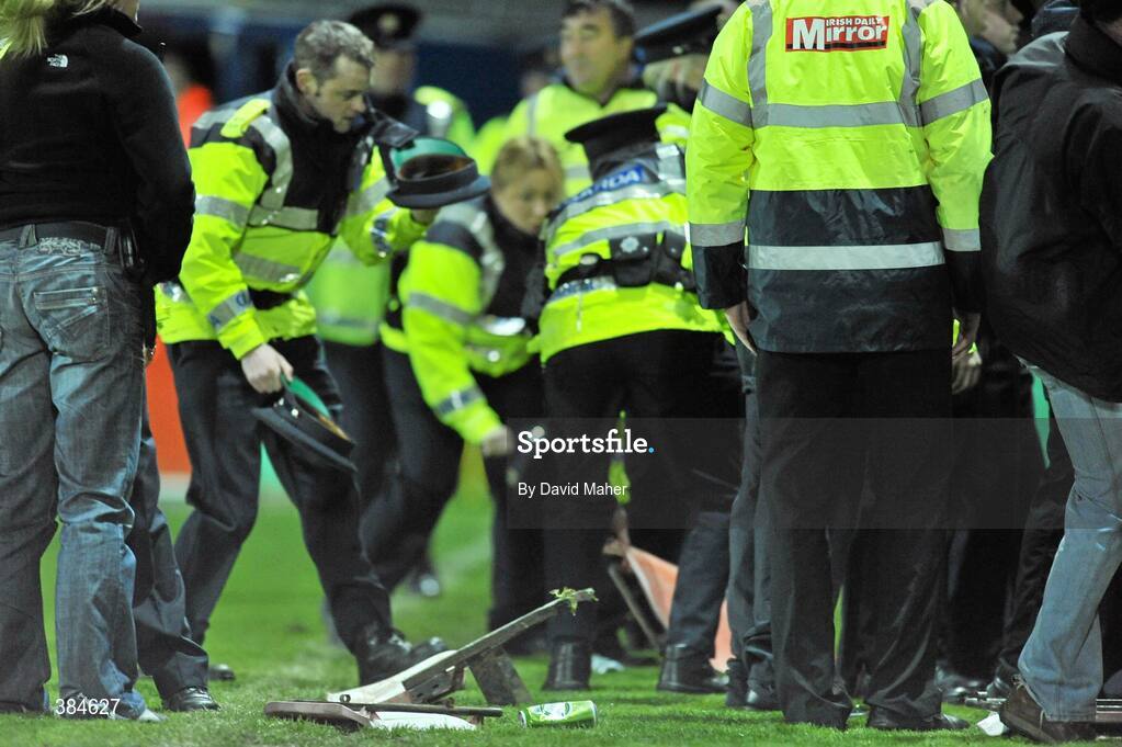 6 November 2009; Members of An Garda Síochana remove broken chairs from the pitch after a confrontation with supporters during the game. League of Ireland Premier Division, Bray Wanderers v Bohemians, Carlisle Grounds, Bray, Co. Wicklow. Picture credit: David Maher / SPORTSFILE