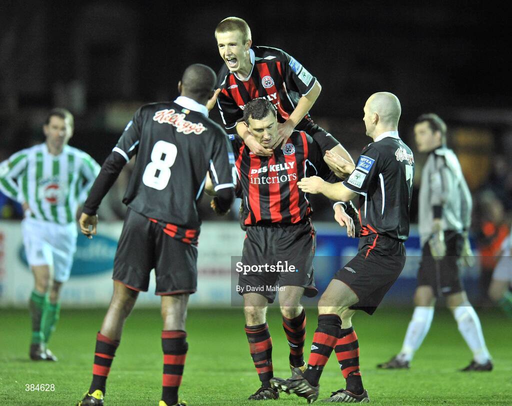6 November 2009; Bohemians' Jason Byrne, centre, celebrates after scoring his side's first goal with team-mates, from left to right, Joseph Ndo, Paddy Madden and Paul Keegan. League of Ireland Premier Division, Bray Wanderers v Bohemians, Carlisle Grounds, Bray, Co. Wicklow. Picture credit: David Maher / SPORTSFILE