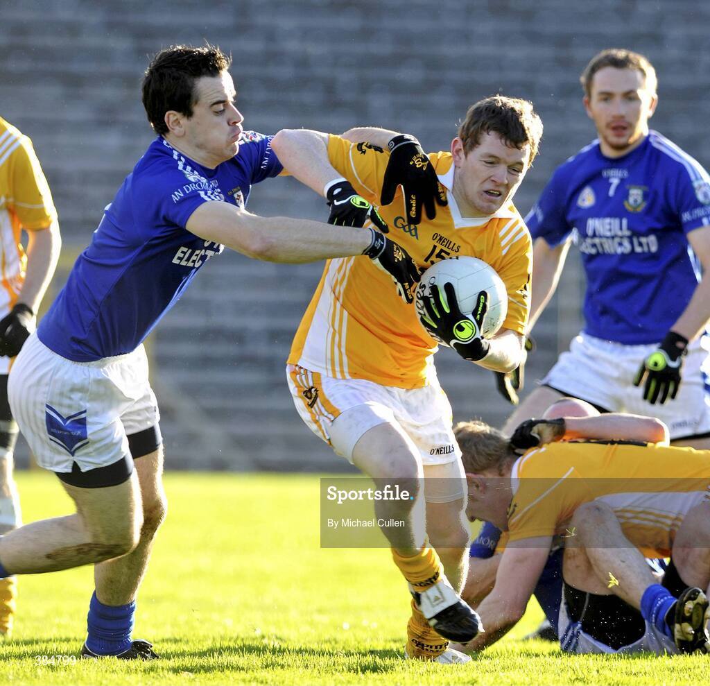 8 November 2009; Rodney Gorman, Clontibret, in action against Cathal McCarron, Dromore. AIB GAA Football Ulster Senior Club Championship Quarter-Final, Clontibret v Dromore, St. Tiernach's Park, Clones, Co. Monaghan. Picture credit: Michael Cullen / SPORTSFILE