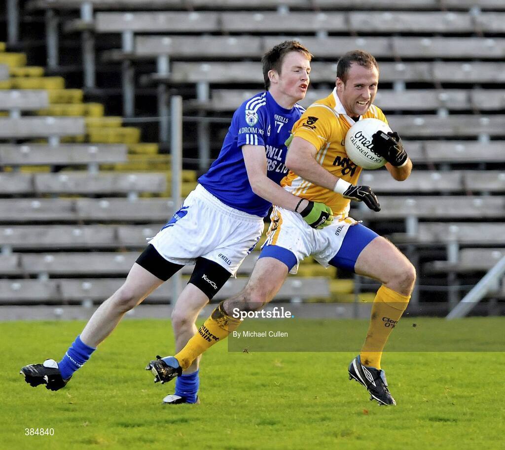 8 November 2009; Martin Corey, Clontibret, in action against Sean McNabb, Dromore. AIB GAA Football Ulster Senior Club Championship Quarter-Final, Clontibret v Dromore, St. Tiernach's Park, Clones, Co. Monaghan. Picture credit: Michael Cullen / SPORTSFILE