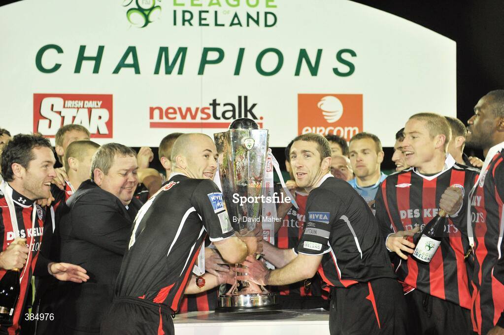 6 November 2009; Bohemians joint captains, Paul Keegan, left and Owen Heary lift the League of Ireland Premier Division trophy. League of Ireland Premier Division, Bray Wanderers v Bohemians, Carlisle Grounds, Bray, Co. Wicklow. Picture credit: David Maher / SPORTSFILE