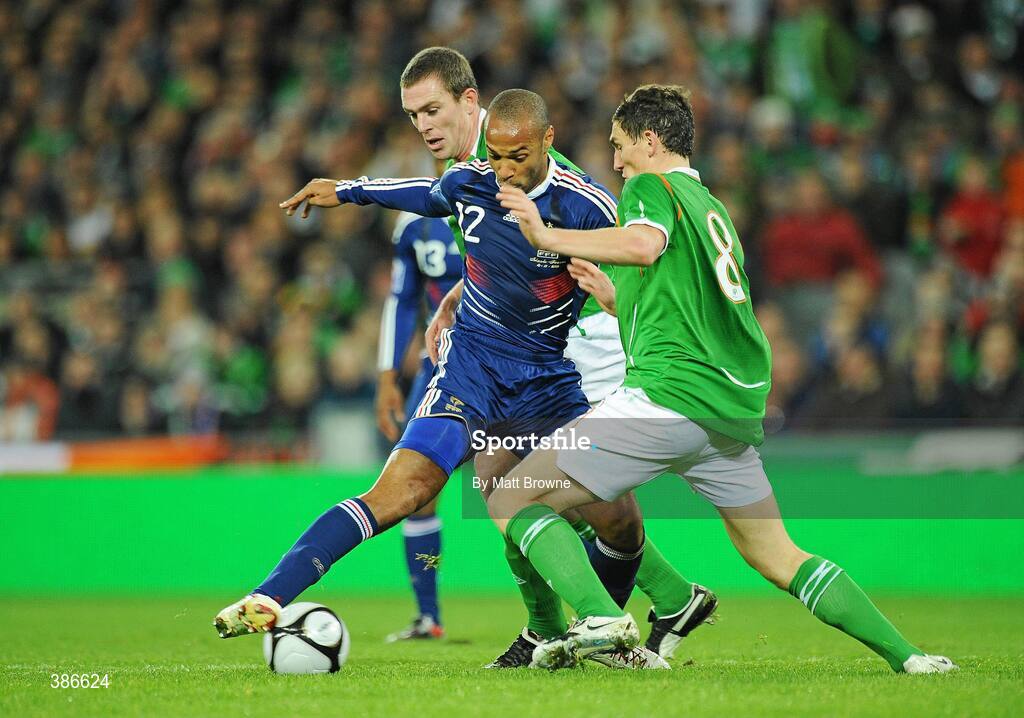 14 November 2009; Thierry Henry, France, in action against Richard Dunne, left, and Keith Andrews, Republic of Ireland. FIFA 2010 World Cup Qualifying Play-off 1st Leg, Republic of Ireland v France, Croke Park, Dublin. Picture credit: Matt Browne / SPORTSFILE