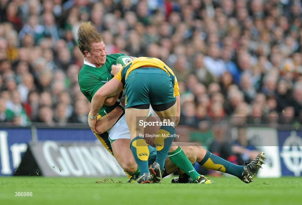 15 November 2009; Jerry Flannery, Ireland, is tackled by David Pocock and Ben Alexander, Australia. Autumn International Guinness Series 2009, Ireland v Australia, Croke Park, Dublin. Picture credit: Stephen McCarthy / SPORTSFILE
