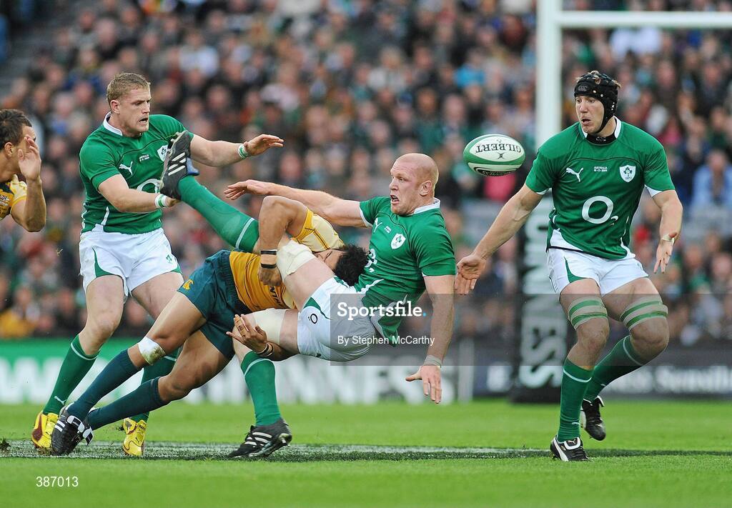 15 November 2009; Paul O'Connell, Ireland, is tackled by Digby Ioane, Australia, as he offloads the ball to team-mate Stephen Ferris, right. Autumn International Guinness Series 2009, Ireland v Australia, Croke Park, Dublin. Picture credit: Stephen McCarthy / SPORTSFILE