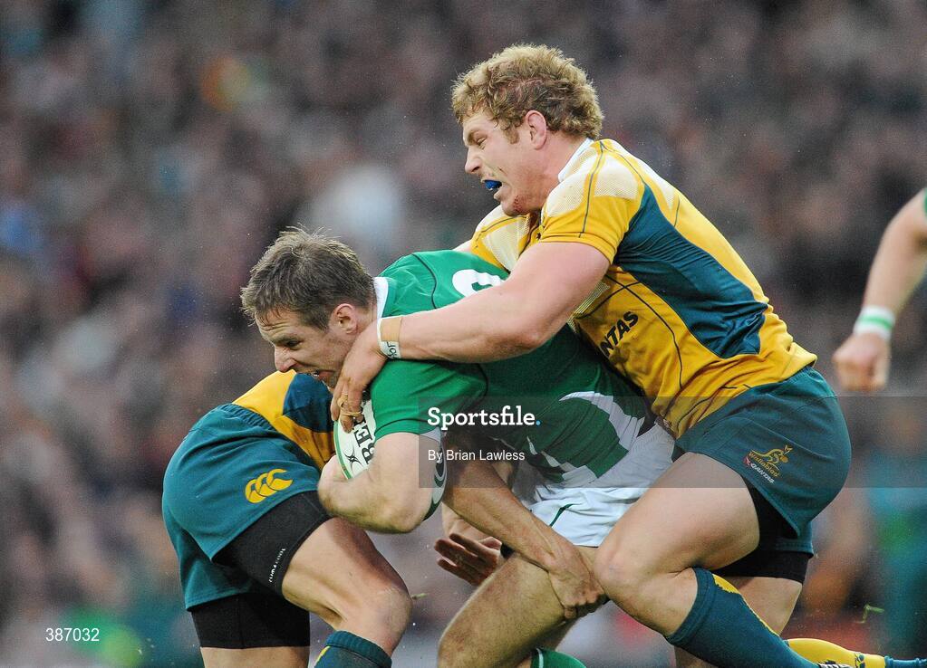 15 November 2009; Tomas O'Leary, Ireland, in action against Matt Giteau and David Pocock, right, Australia. Autumn International Guinness Series 2009, Ireland v Australia, Croke Park, Dublin. Picture credit: Brian Lawless / SPORTSFILE