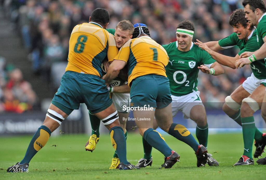 15 November 2009; Jamie Heaslip, Ireland, supported by, from left, Paddy Wallace, Donncha O'Callaghan, and Cian Healy, in action against Wycliff Palu, left, and Benn Robinson, Australia. Autumn International Guinness Series 2009, Ireland v Australia, Croke Park, Dublin. Picture credit: Brian Lawless / SPORTSFILE